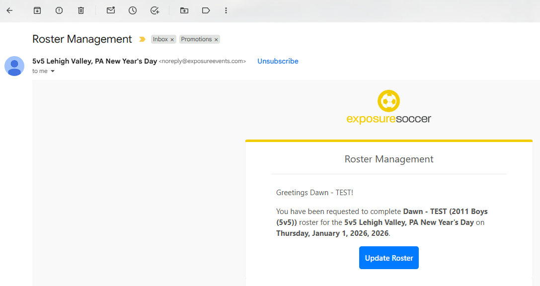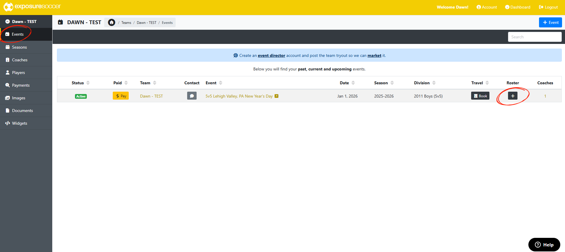 The Coach or manager adds the players to the roster in Exposure (the same system used to register the team for the event)