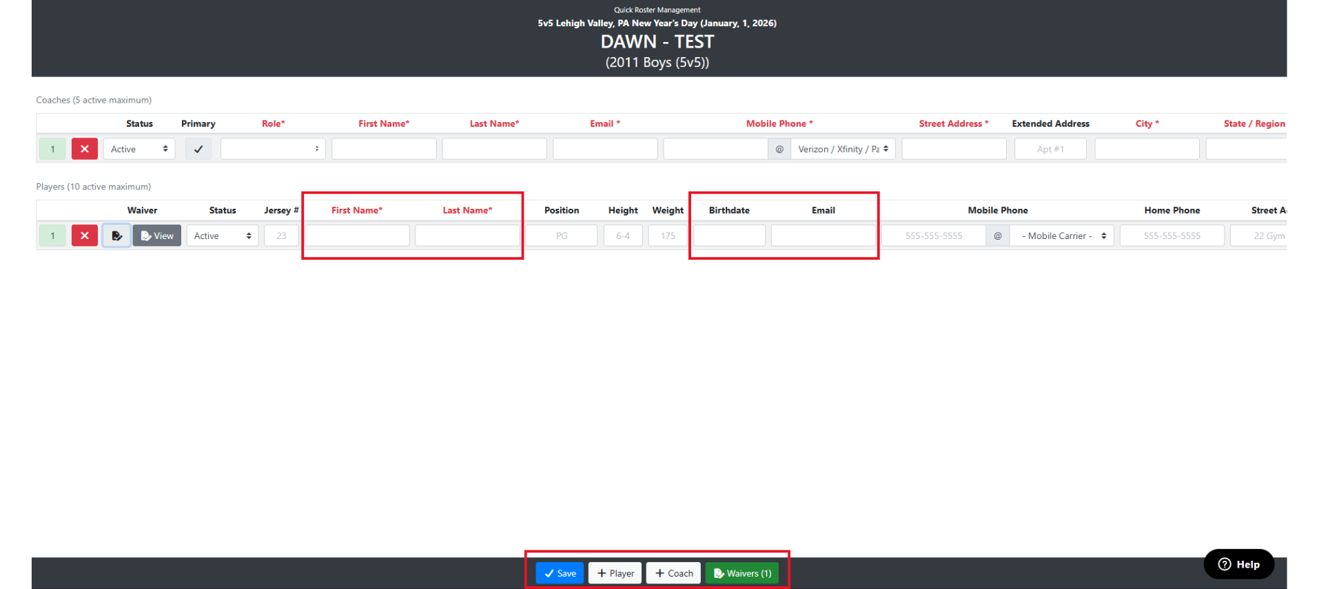 NOTE: The team rosters must be completed no later than the day prior to the event you're participating in. Please be sure to head to the check in table no later than 30 mins prior to the start of your first game to check your team in. Only one coach / manager is required at check in.