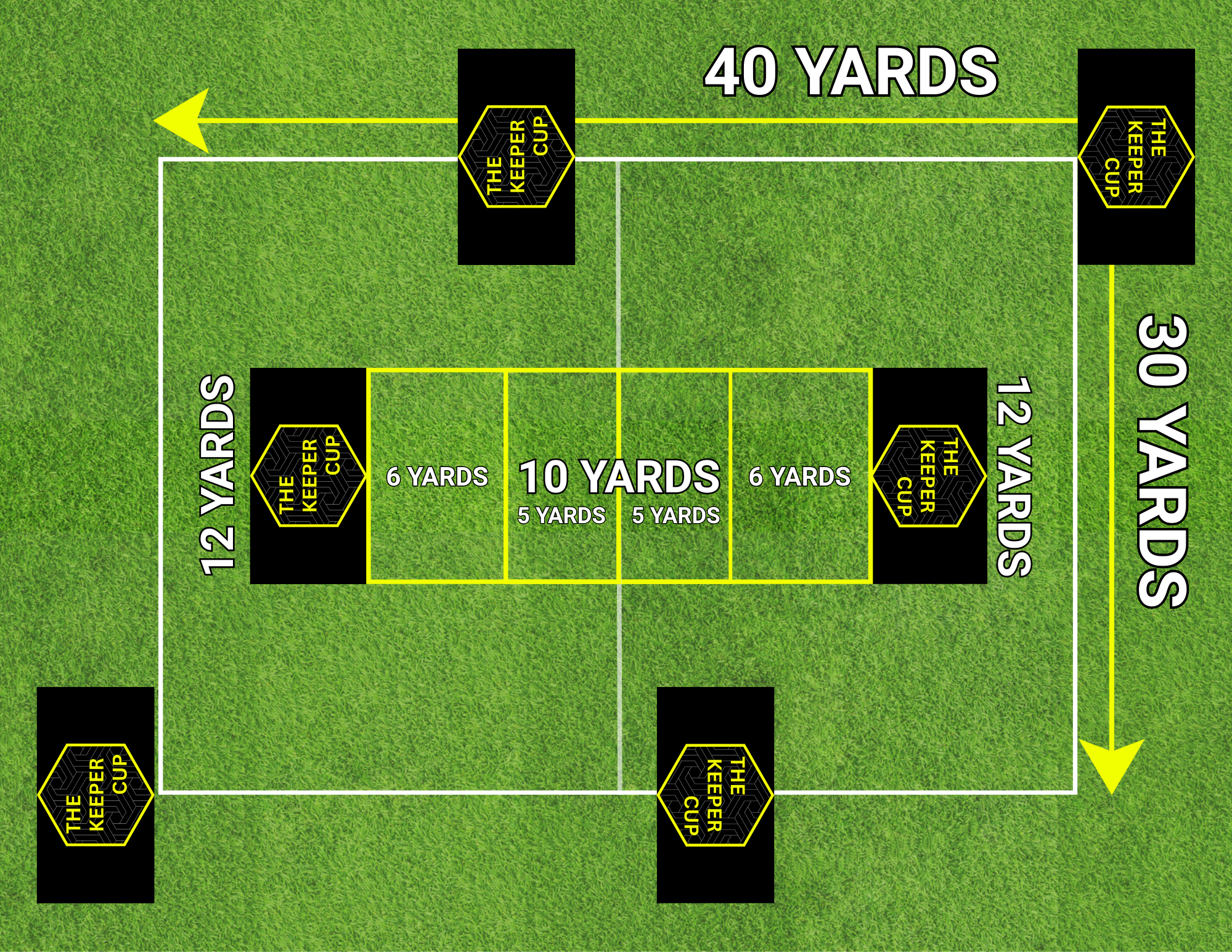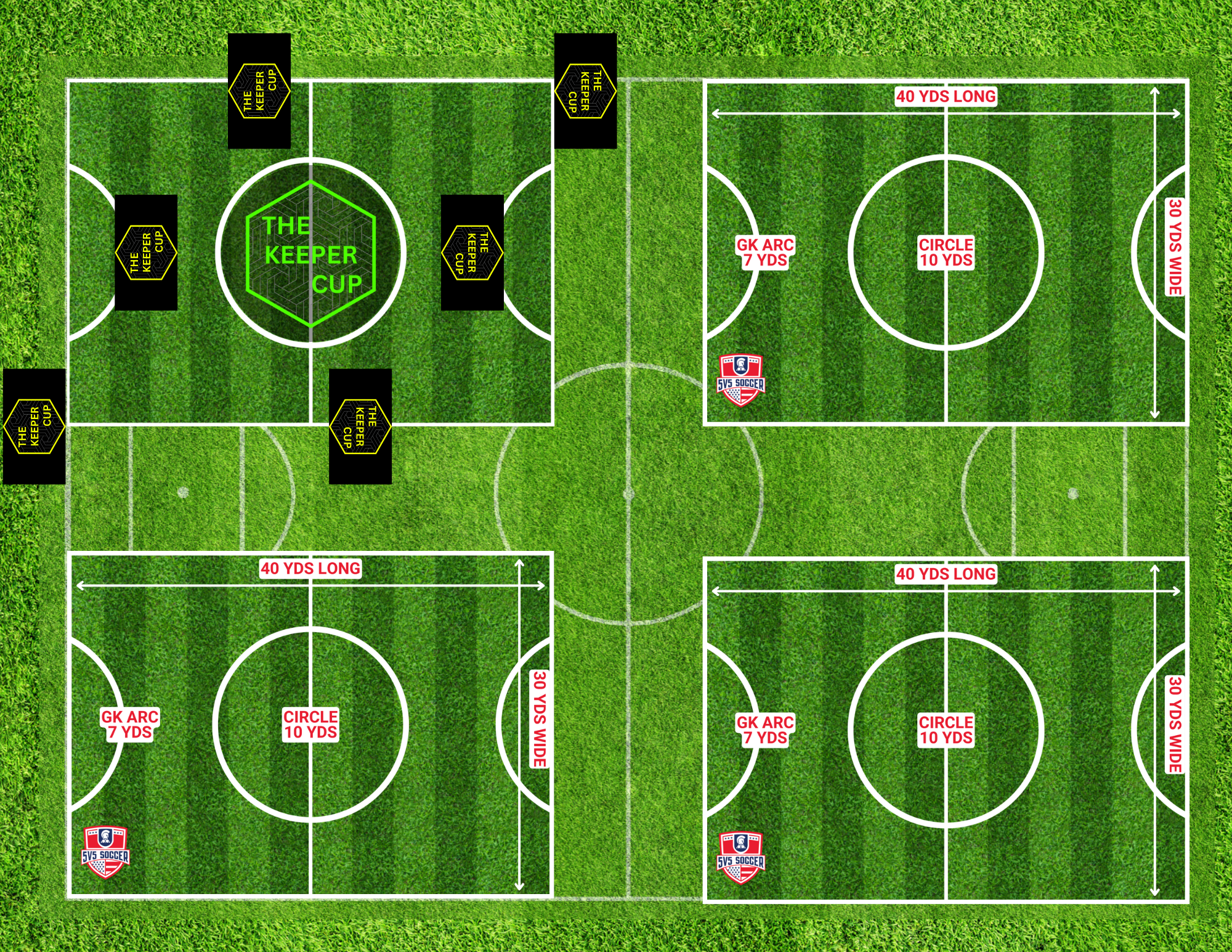 Field: 30 yards by 40 yards (3 Keeper Cup fields)