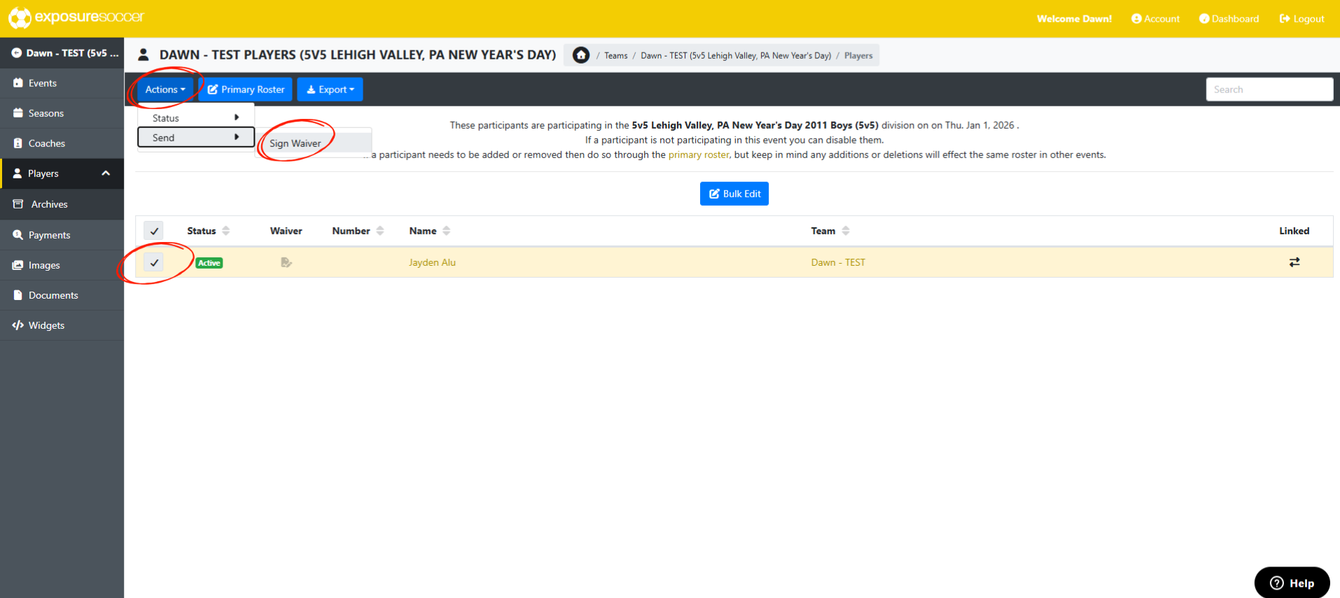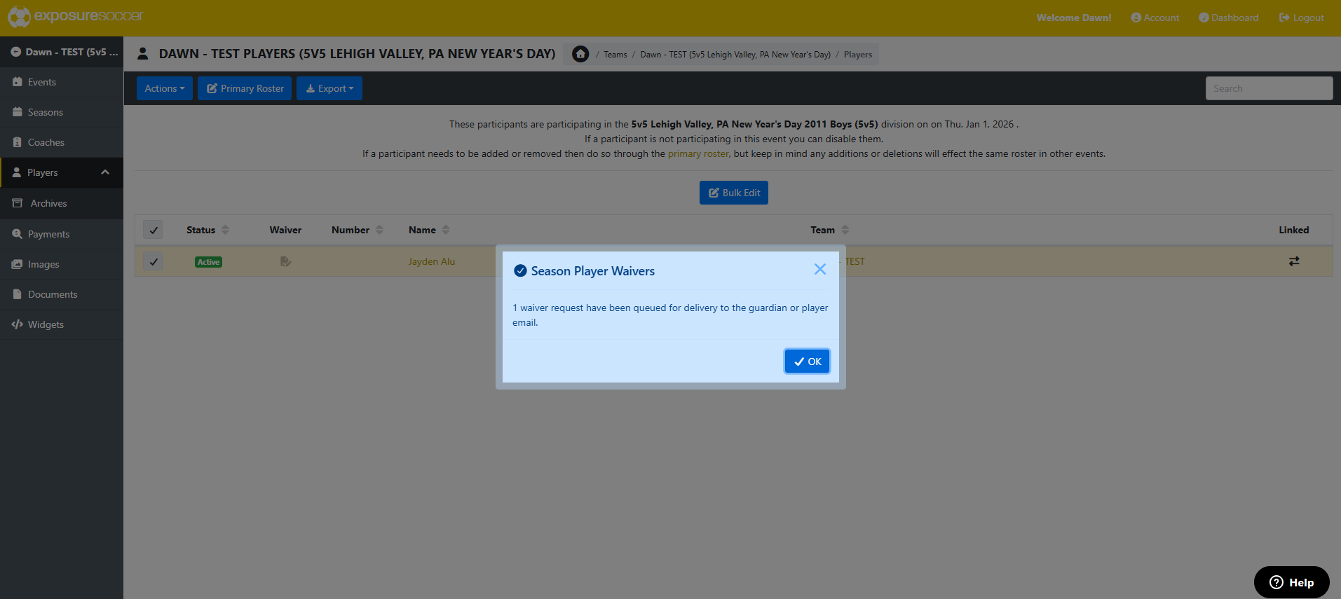 Once the players are added to the roster with a valid email address, coaches & admins will select all players and send a waiver request. A reminder will be automatically sent to the email address listed for anyone who has not completed the waiver within 4 days.