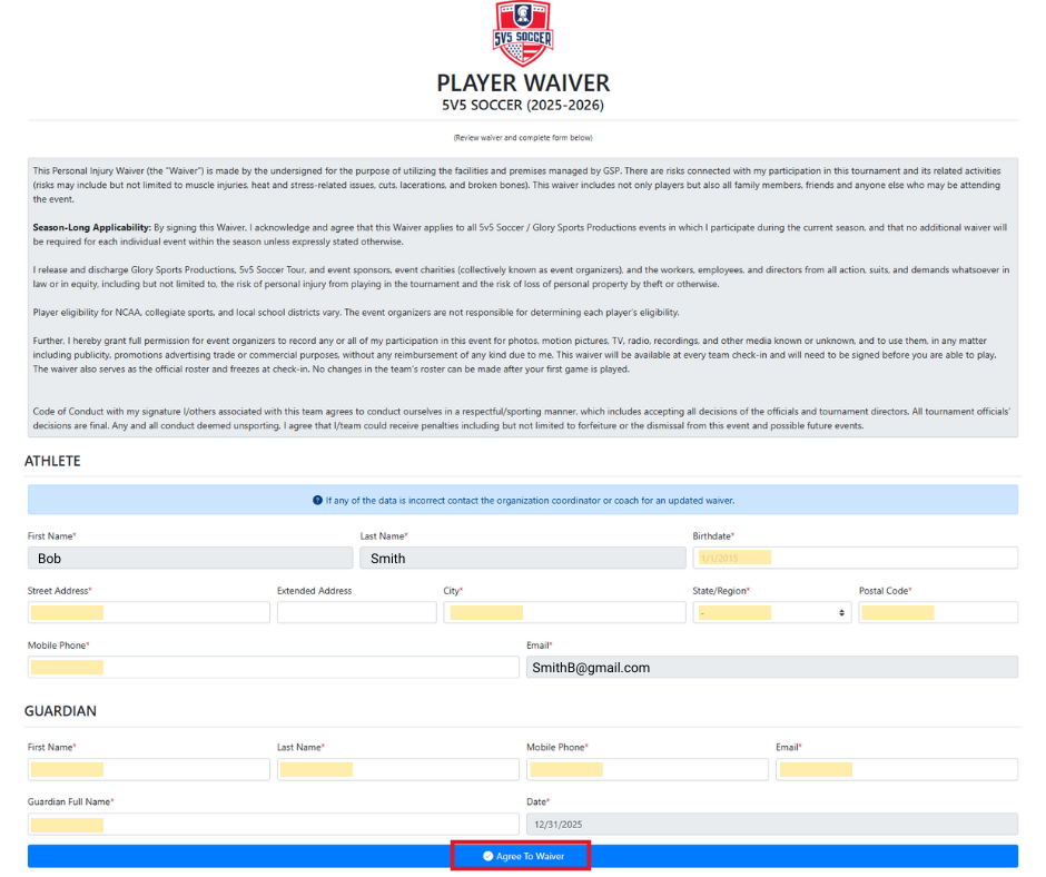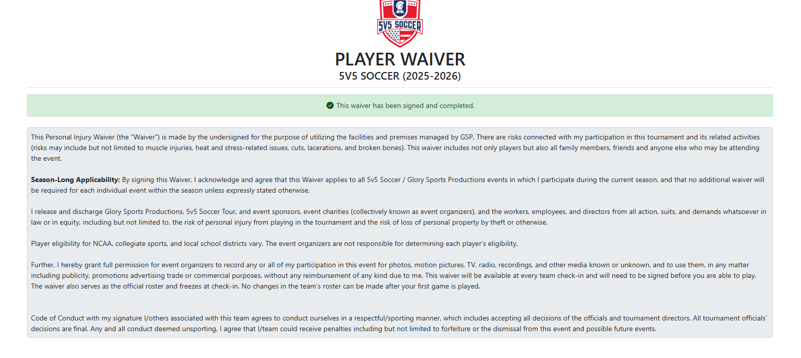 NOTE: The waivers are good for the full season (Dec 1, 2025 - Nov 30, 2026). If a player is playing in multiple events throughout the year, they will only need to complete a waiver for the first event they play in for that given season.